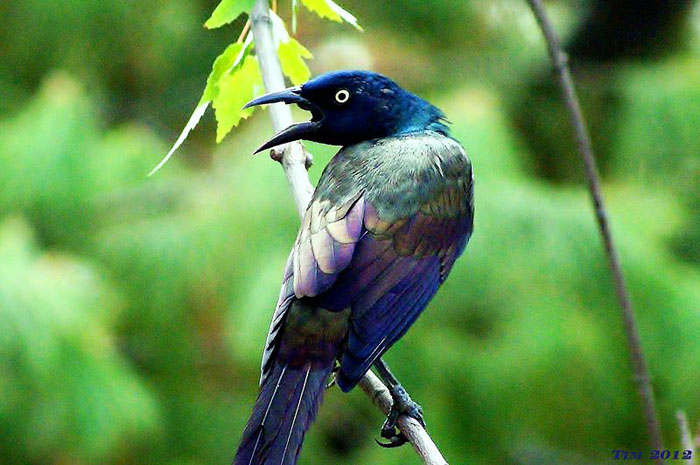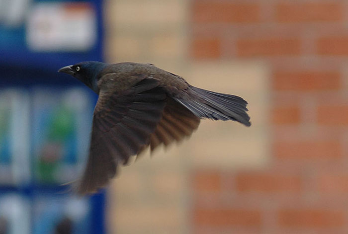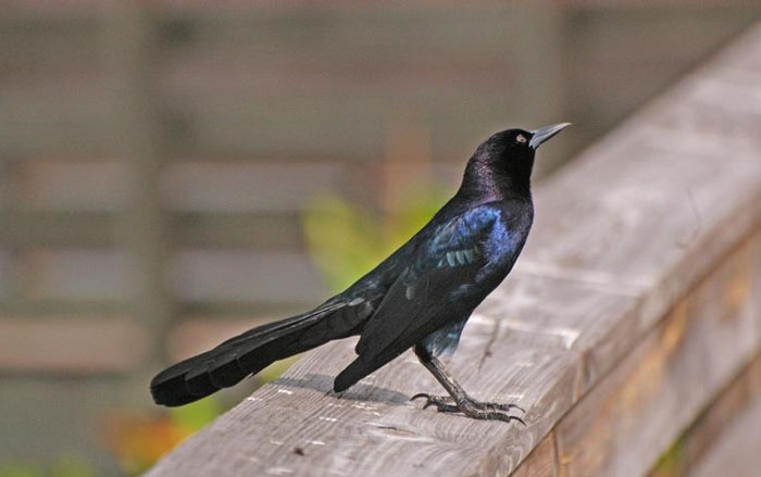Common GrackleThe Common Grackle is a social, noisy relative of the blackbird. The Grackle looks very similar to the blackbird, but is slightly longer with glossy, iridescent feathers. It has a purple head and a bronze body. Look for Grackles gathered in large, noisy flocks with cowbirds and blackbirds.