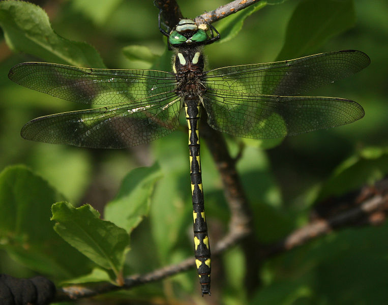 Spiketails have wide heads and clear to smoky black wings. They are brown or black with yellow markings. They have large green or blue eyes that meet on the top of their heads. |
