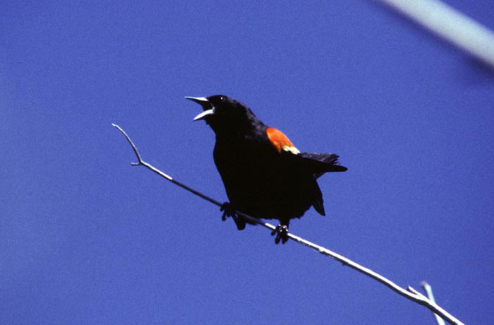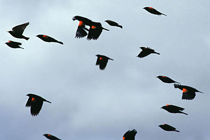Red-winged BlackbirdThe male Red-winged Blackbird is a fierce defender of his territory. He is constantly chasing other males out of his territory and will attack predators. Sometimes he will attack larger animals like horses and humans!