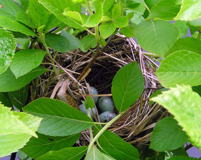 In her nest, she lays 2-4 pale blue eggs, which she incubates for about two weeks. When they hatch, the chicks are blind and have no feathers. The chicks remain in the nest for about 14 days.