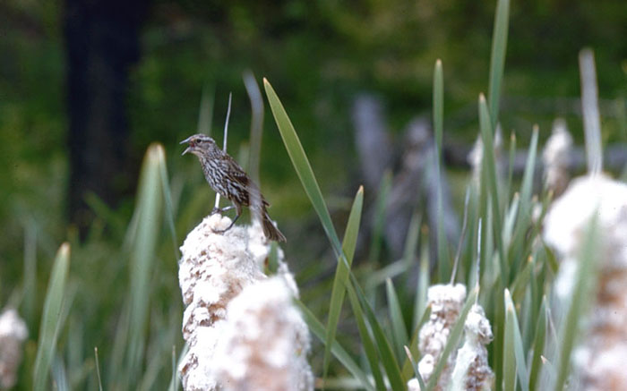 Red-winged BlackbirdThe female Red-winged Blackbird is a master nest-builder. In a wet area like a marsh, she weaves reeds around the base of tall marsh plants, such as cattails. Throughout her nest, she adds wet leaves and decaying wood to add strength. She then plasters the inside with mud and lines the nest with fine grasses.