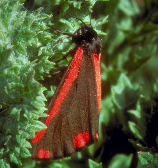 The Cinnabar moth has black wings with bright red patches.