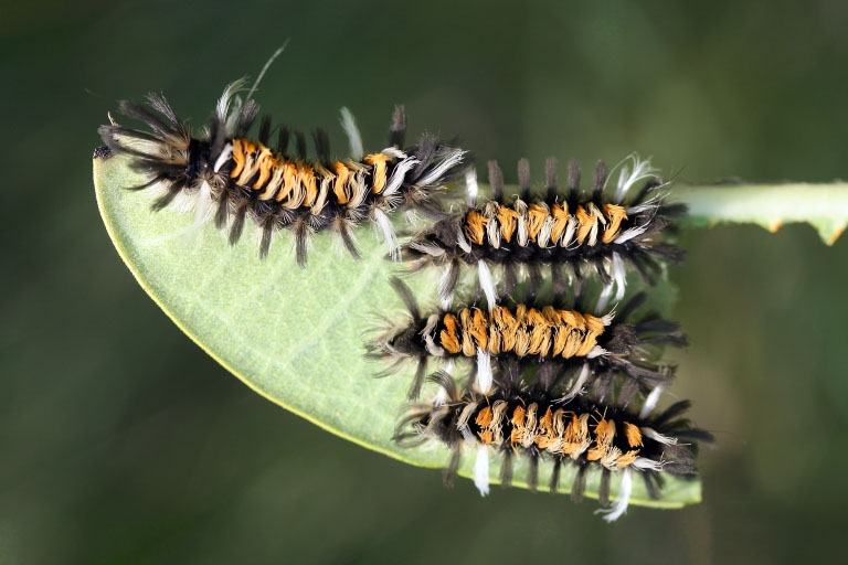 The milkweed tussock moth caterpillar is found on milkweed.
