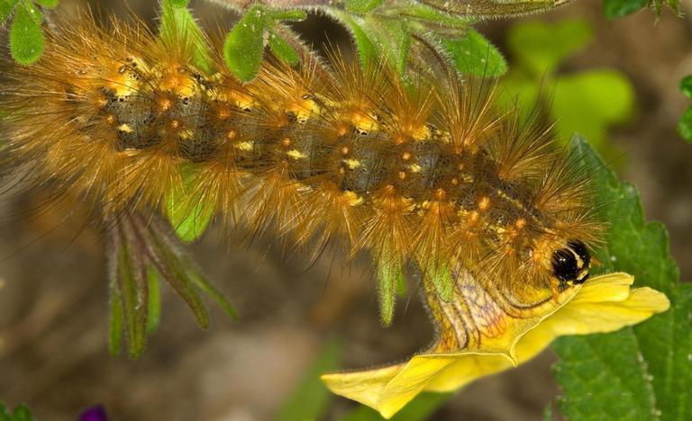 The Isabella tiger moth caterpillar is found on asters, birches, clover, corn, elms, maples, and sunflowers.