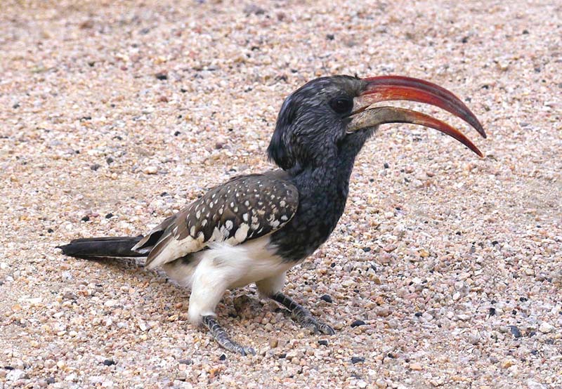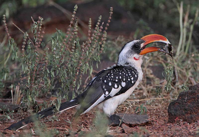 The southern yellow-billed hornbill forages on the ground for seeds, insects, spiders, and scorpions.