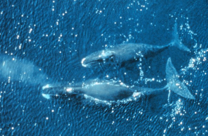 Bowhead WhaleCetaceans have long, torpedo-shaped bodies; front flippers; hind limbs that are on the inside of their bodies; and tails that end in horizontal flukes. They have an air or blowhole on the top of their head. They have a layer of fat or blubber and a three chambered stomach. Like most mammals, they give birth to live young and feed them milk. Most species in this order are very social and live in groups called pods. There are two suborders in this order - the Mysticeti, or baleen whales and the Odontoceti, or toothed whales. Baleen whales have two blowholes and a plate of baleen that hangs from their upper jaws. Baleen is made of a protein like the one found in human fingernails. The baleen plate is very flexible, and baleen whales use it to strain water through it to capture zooplankton, small fish, and krill and other small crustaceans. Toothed whales have teeth and a single blowhole. There are 70 species in this order in 10 families.