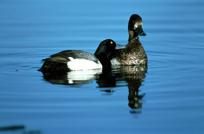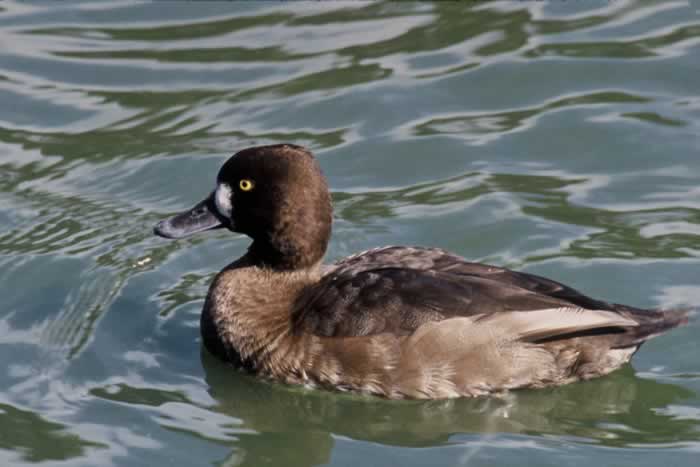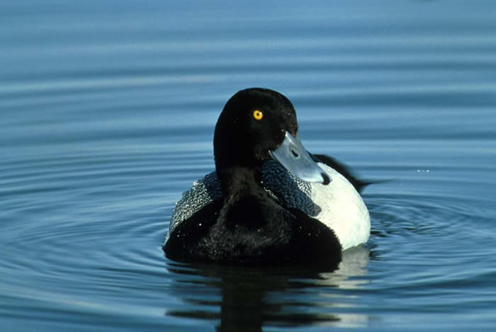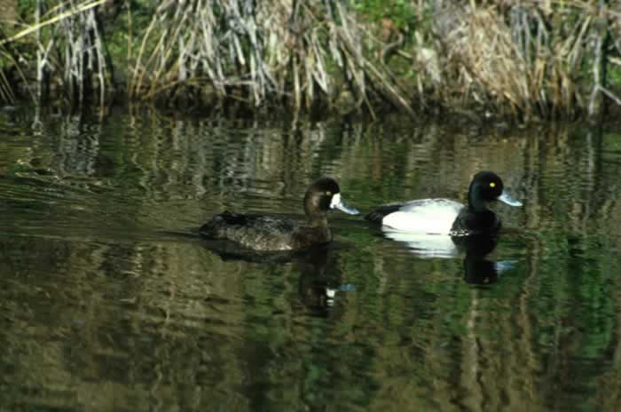 Lesser ScaupThe lesser scaup is a small diving duck. It is 15-18 inches in length with a wingspan of 27-30 inches. It has a slightly pointed head, yellow eyes, and a grayish-blue bill with a small black tip. The male has a black chest and tail and gray sides. He has a purple head that looks black.