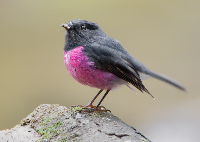 The male pink robin is brownish-black with a pink breast and belly.