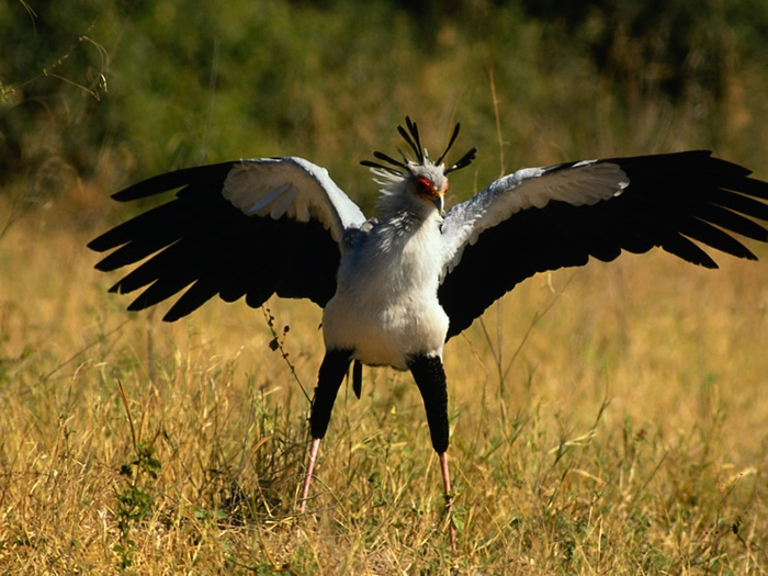 The secretarybird kills reptiles and small mammals with its long powerful legs.
