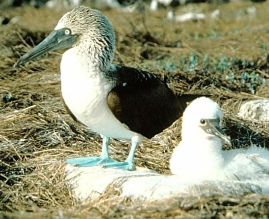 The blue-footed booby uses its blue feet to keep its young warm.